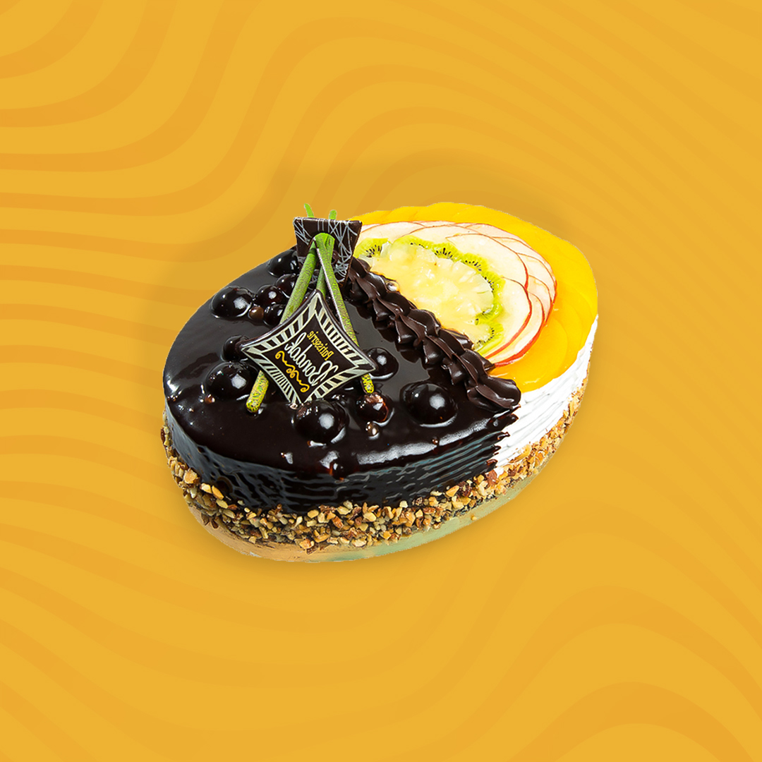 تورته هاف بابلي وفروت بطبقات من الكيكة الاسفنجية وحشو الكريمة والفينش شوكليت بابلي وشرائح من الفواكه وقطع من المكسرات