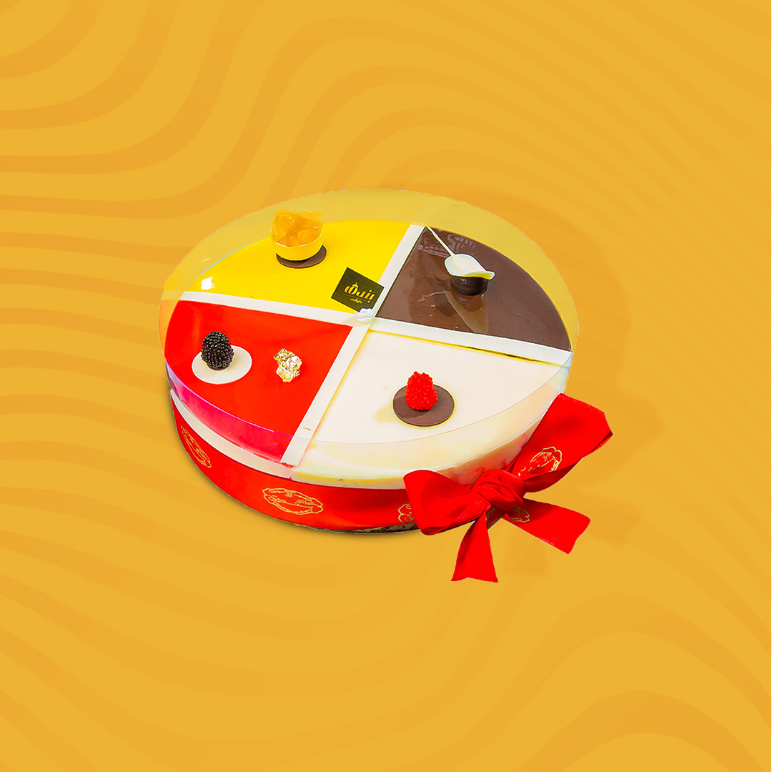 طبقات من الكيكة الاسفنجية بحشو الكريمة اللباني ومقسمة علي اربع اجزاء والفينش طبقة من الموسم الوايت والشوكليت والراسبري والمانجو