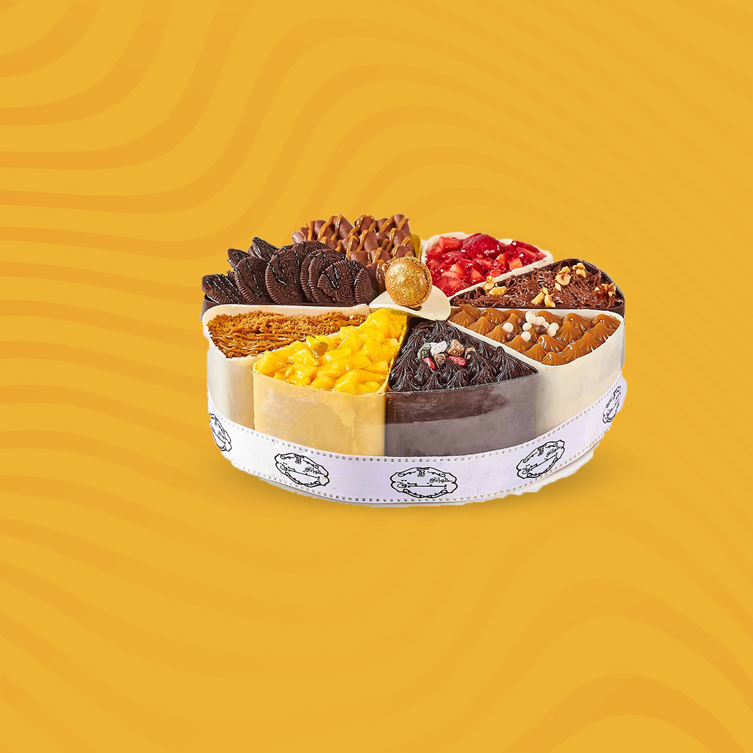 طبقات من الكيكة الاسفنجية بحشو الكريمةوالفينش مقسم علي 8 اشكال فرولة ومانجو وشوكليت جناش وكراميل ولوتس واوريو وفلوتس ونوتيلا